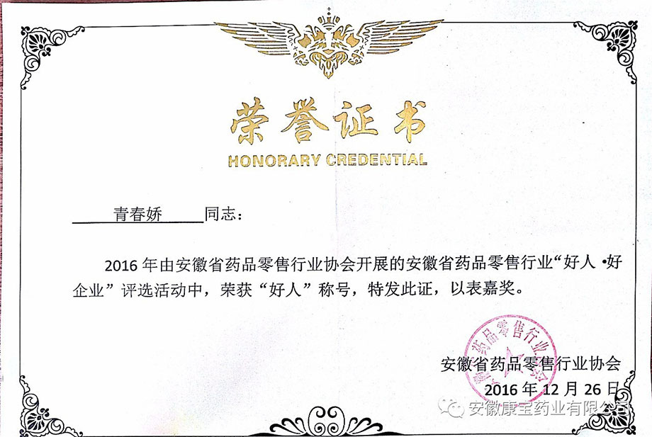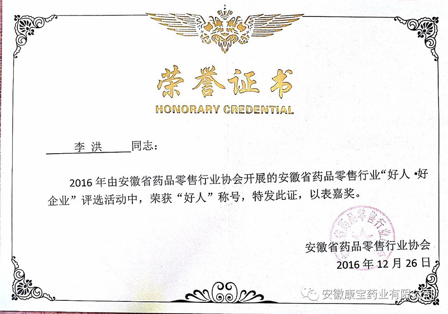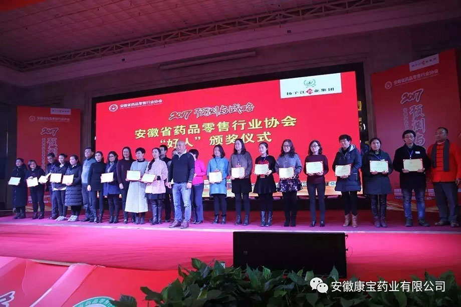 歲末好事不斷,康寶獲獎連連。12月26日,由省藥品零售行業協會主辦的安徽省藥品零售企業“好人 好企業”頒獎典禮在省城合肥隆重舉行?;茨蠔|方醫院集團全資子公司康寶藥業通過逐級推薦、層層考核、公開評審等程序,最終被評為“好企業”稱號,康寶藥業員工青春嬌、李洪被評為“好人”稱號。